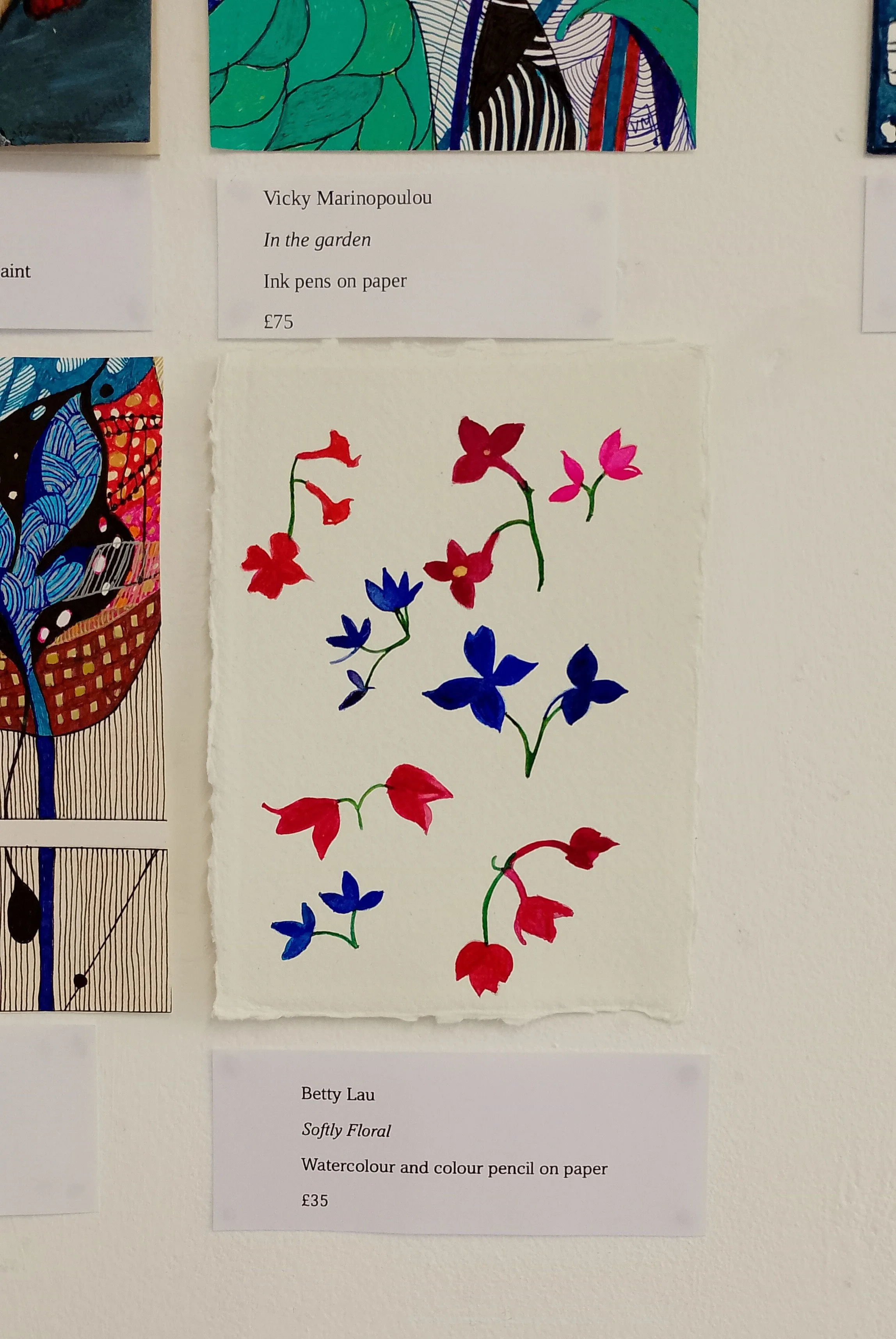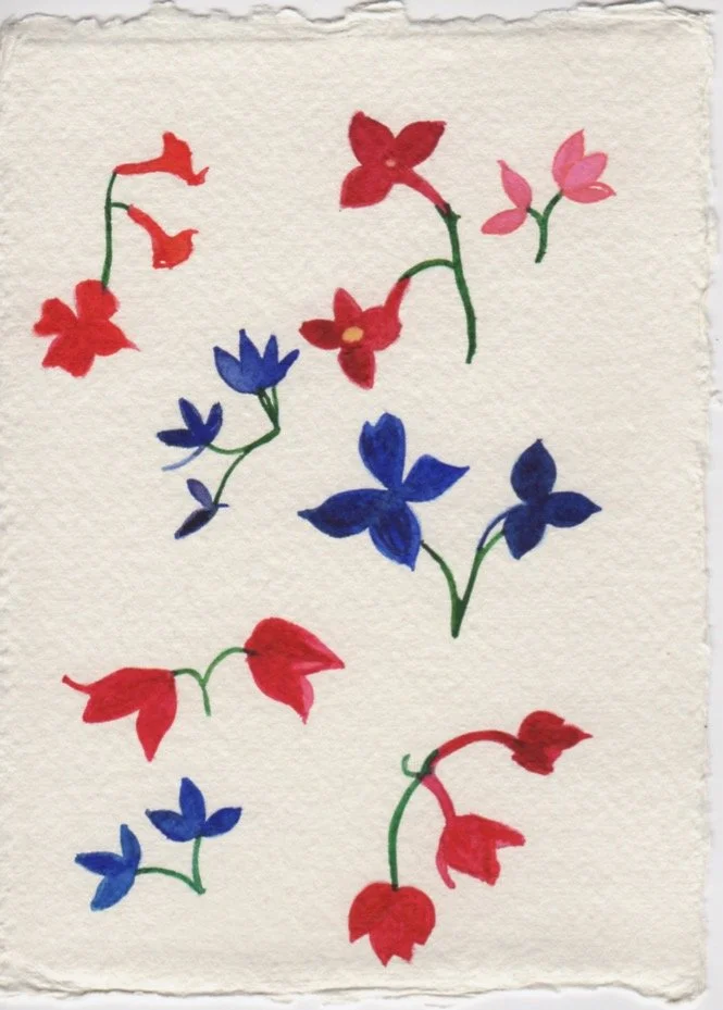 This postcard features a gentle scattering of small flower motifs, each one softly blooming with translucent layers of pigment. The blossoms, painted in tender washes of pastel hues-red, opera rose, and blue- drift across the paper like whispers of summer.