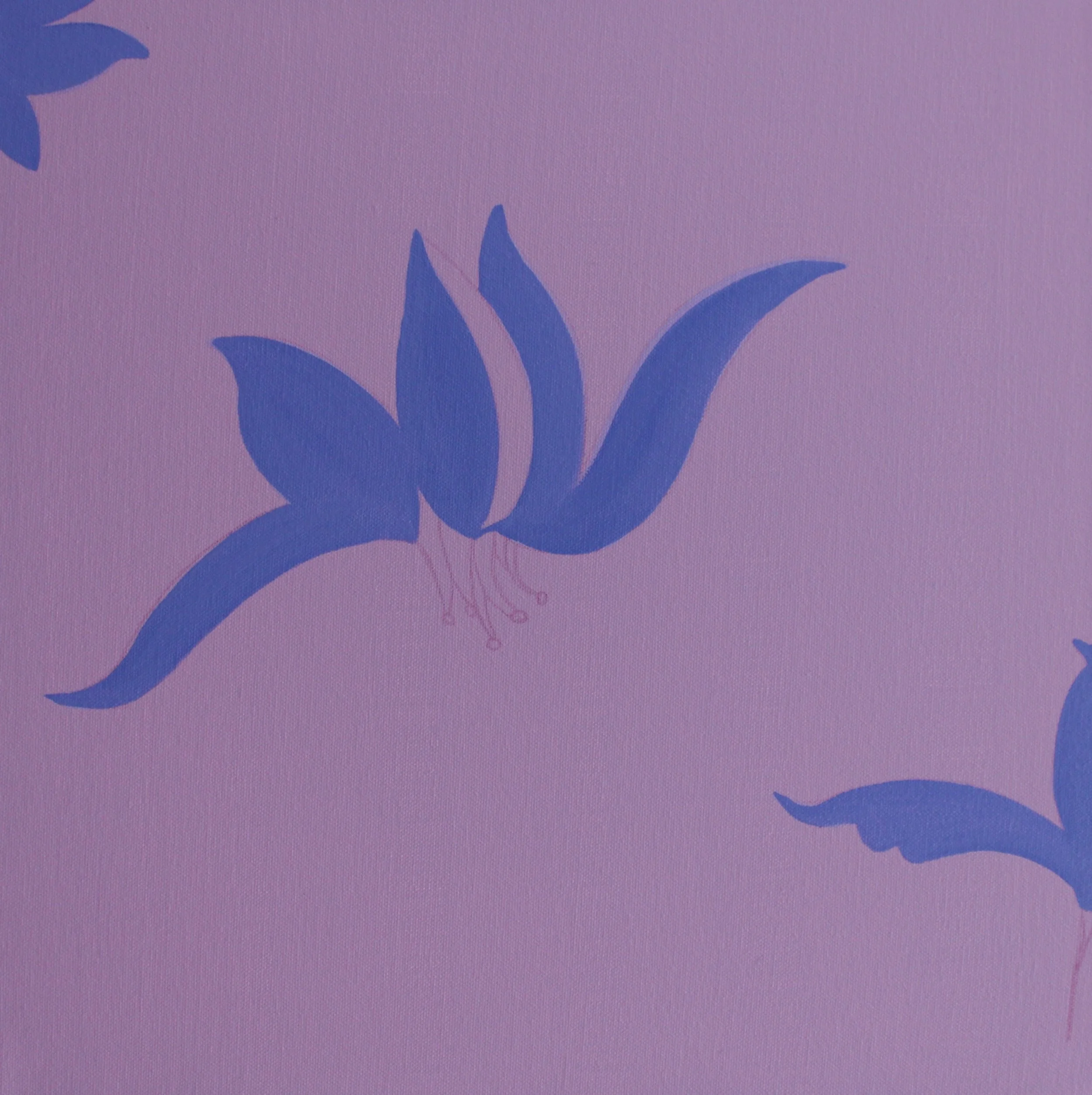 Each bloom is depicted with vibrant violet, their petals unfurling like wings in mid-flight, evoking a sense of freedom and lightness. The painting creates a tranquil atmosphere to present the beauty of nature.