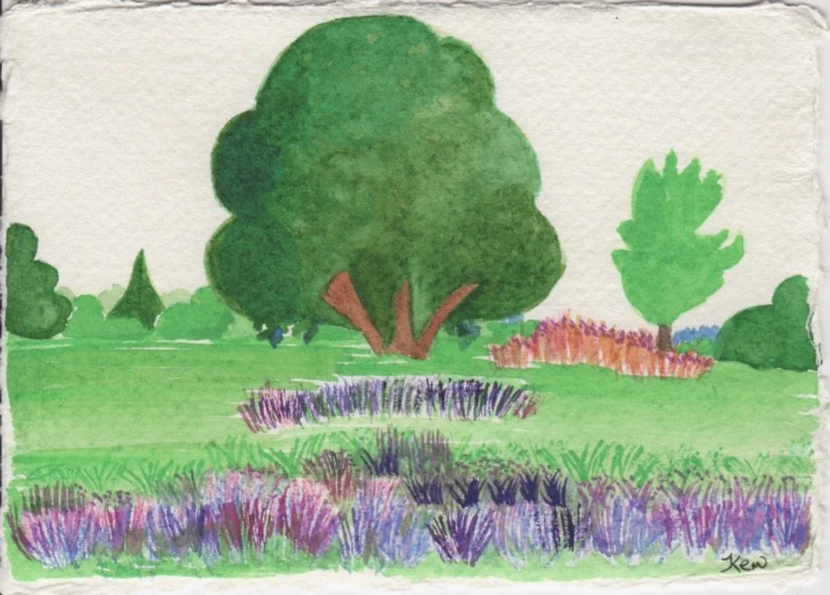 An evergreen tree stands proudly at the back of a lavender field, its broad canopy casting a soft shadow over the vibrant purple blooms.