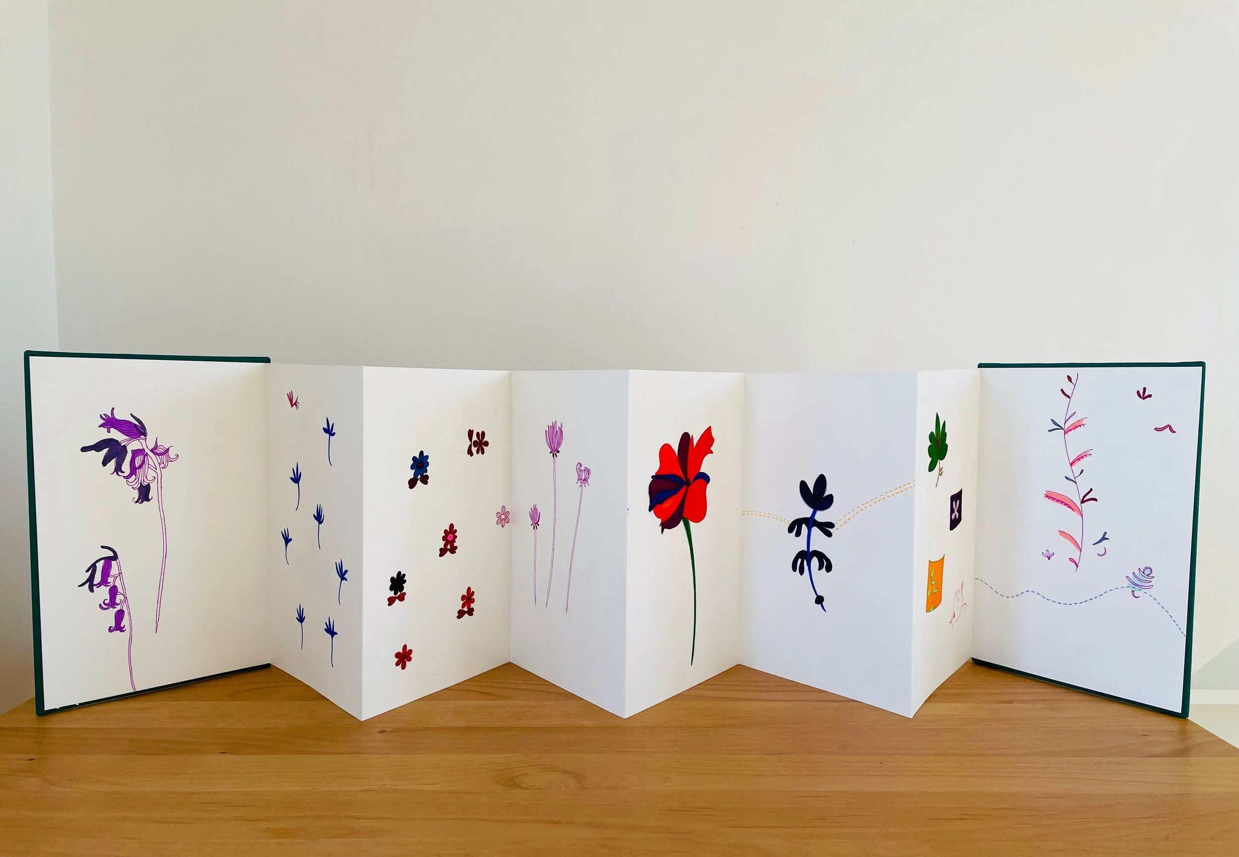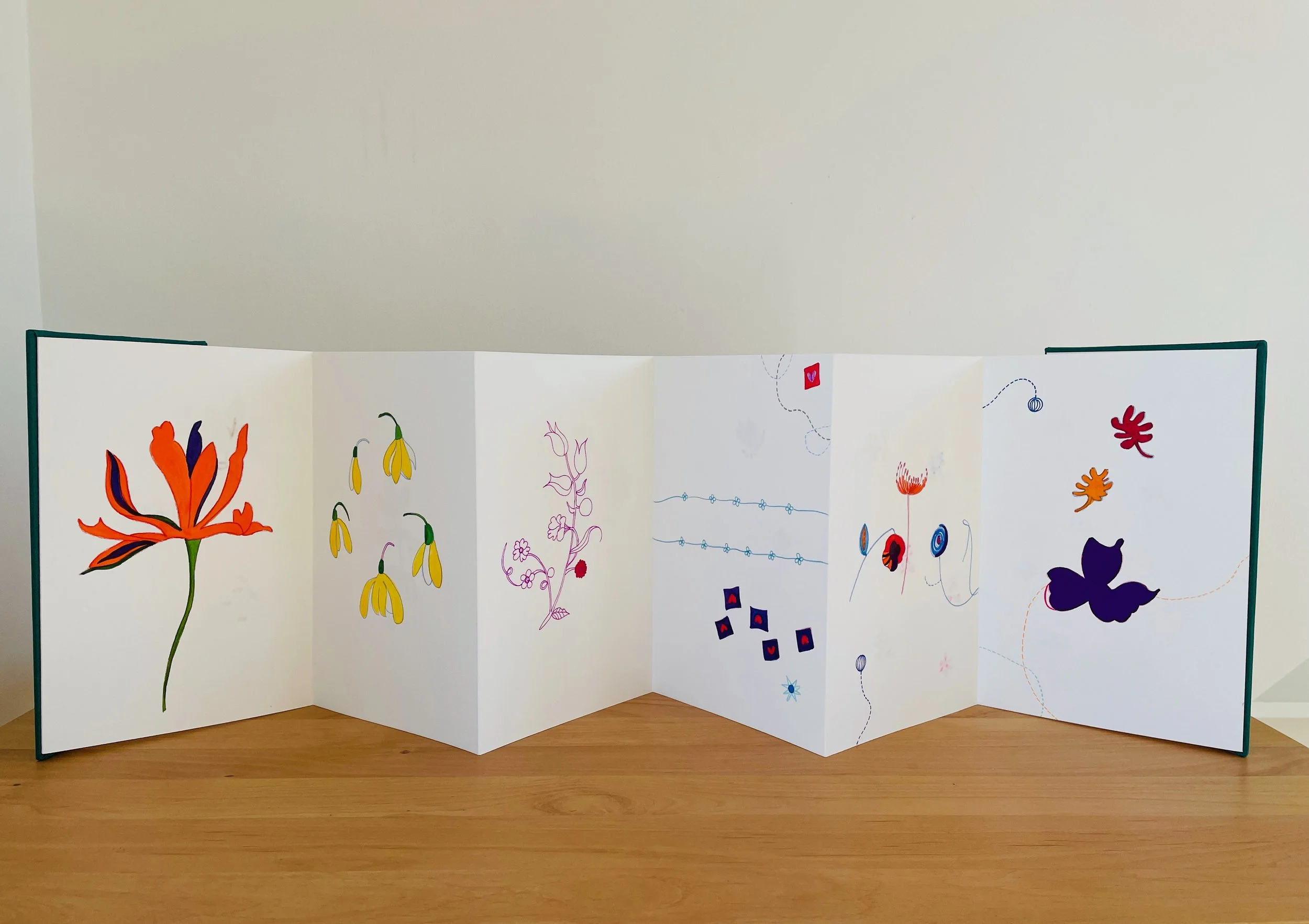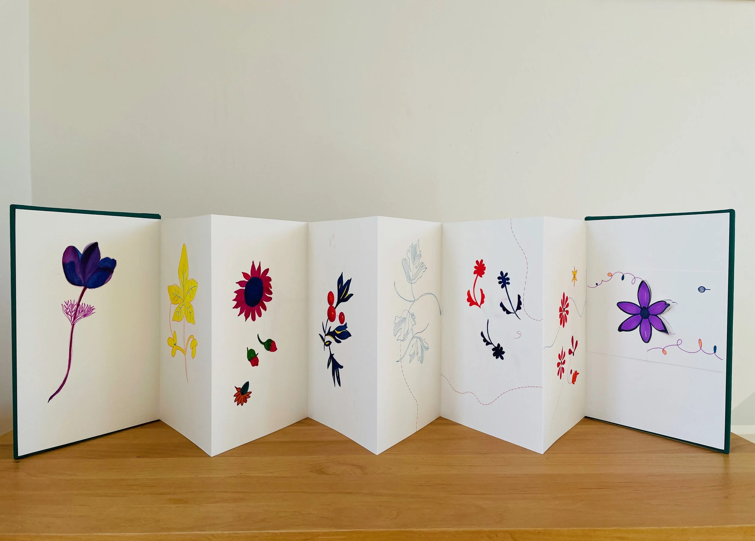 Flora I, watercolour, colour pencil and marker on concertina book (7 folds), 23.5 cm x 16 cm (back), 2022