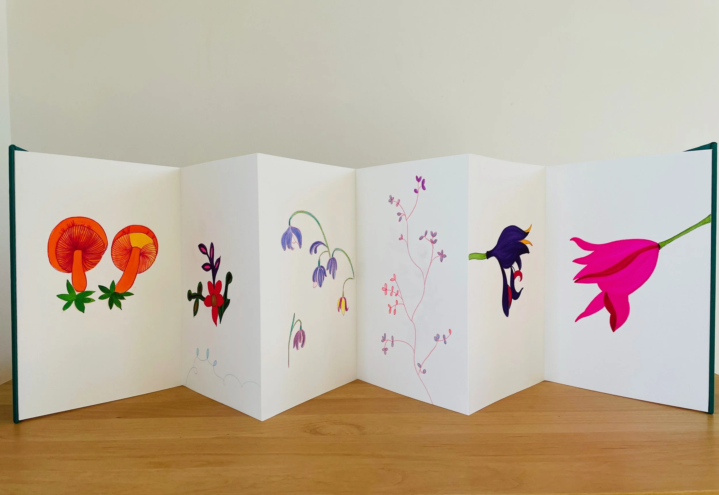 Flora II, watercolour, colour pencil and marker on concertina book (7 folds), 23.5 cm x 16 cm (front), 2022